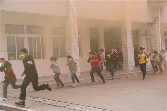9点05分随着警报声的响起,现场总指挥宣布演练开始。广播里施放警报声与每分钟60次节拍音合成声,校园中也燃起了浓浓的烟雾,各班班主任组织学生迅速进入火灾紧急疏散状态:班主任快速安排学生做好疏散前的准备,全体学生分别从前后门疏散,面向疏散方向成两路纵队集合,猫腰并用湿毛巾等捂住口鼻有序撤出教室。楼层引导员指明师生的疏散方向,楼梯拐角安全员在高声地提醒师生。师生均按照逃生演练方案设定的逃生路线,迅速而有序地从各教学楼、各层、各班撤离到学校操场开阔地带,没有出现拥挤、踩踏等安全事故。学生到达操场后,每班按4路纵队蹲下,班主任清点本班人员情况并填写报告表。年级组长向总指挥报告本年级人数和情况……短短2分10秒,整个火灾应急疏散演练活动规范、有序、紧凑、安全、高效,老师和同学们临危不乱,有序撤离,火灾应急疏散演练获得了圆满的成功。