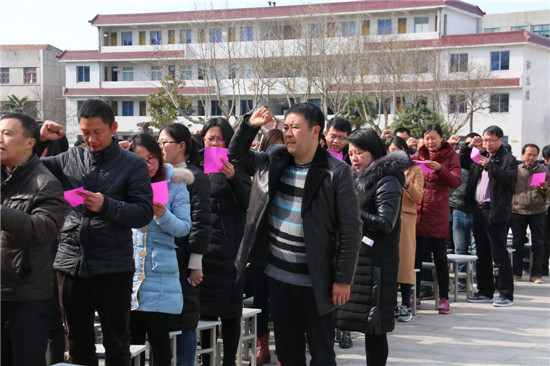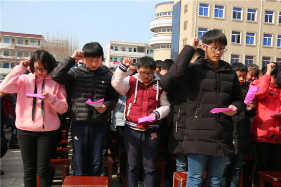 接下来初三学生的宣誓口号,震撼人心,催人奋进,让人热血沸腾,激动不已!随后,教导处王鹏主任带领全体初三教师庄严宣誓,在这最后一百天的时间里,全体教师将团结一心,用最无私的奉献、最贴心的关怀成为学生们最坚强的后盾,共同创造2017年中考新的辉煌。慷慨激昂的誓言在广场上久久回旋,激励着同学们战胜困难,发奋图强,用今日的努力创造明天的辉煌!