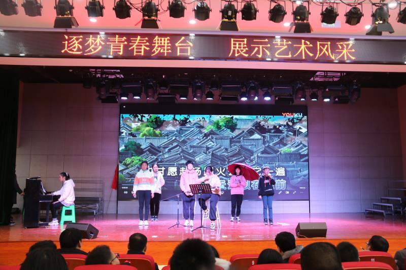 此次校园文化艺术节主题为:逐梦青春舞台,展示艺术风采。艺术节活动历时一个星期,包括七年级才艺展示、书法绘画比赛和七八年级合唱比赛,其中将挑选优秀的节目入选12月31日的艺术节闭幕式。本次艺术节活动内容丰富多彩,涉及班级集体类节目、个人表演类节目、现场书画等。独唱、合唱、道情说唱、器乐演奏、舞蹈、相声、小品、诗朗诵、校园剧等节目经过细心的排练,真正达到了“和谐舞台,人人参与”的目的。从服装道具的准备,到动作造型的设计,音乐老师、班主任们以及家长们付出了极大心血,保证了一台台演出的精彩呈现。