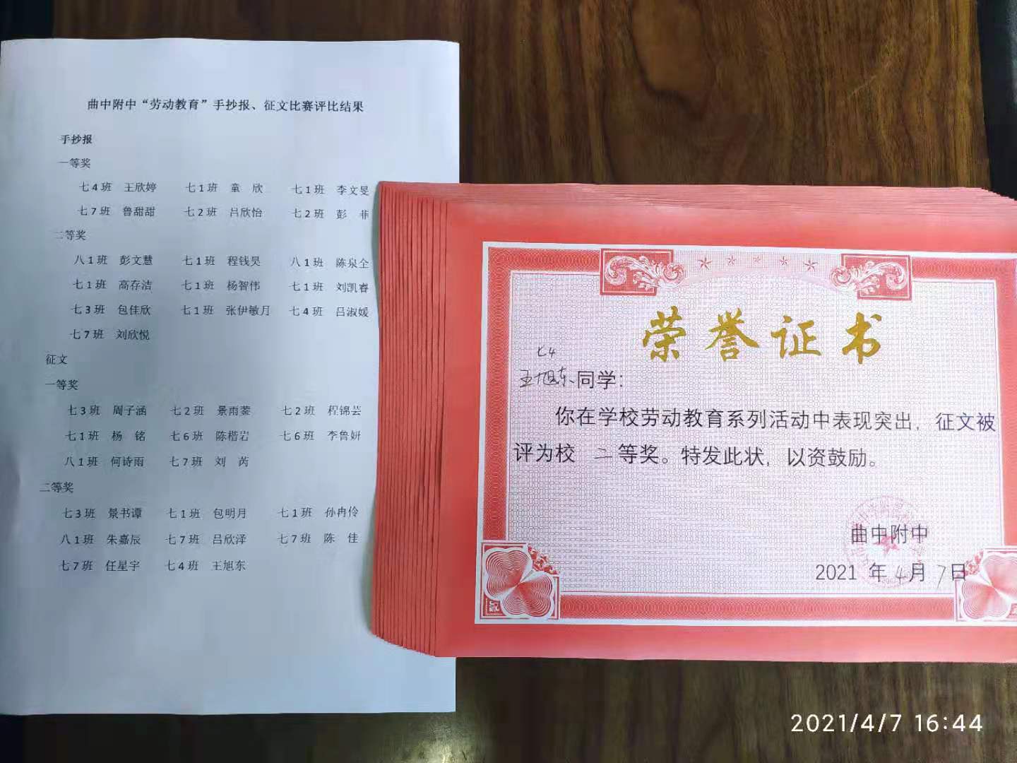 曲中附中举办劳动教育手抄报、征文比赛活动